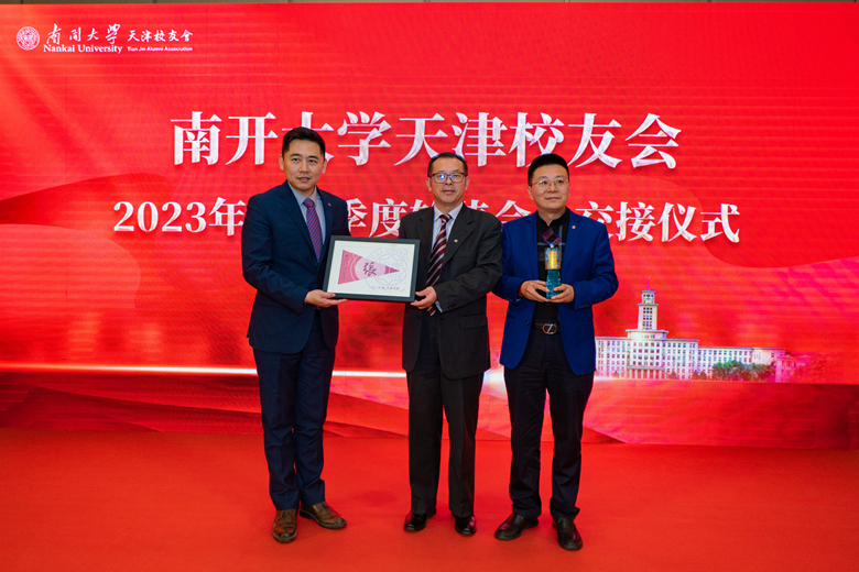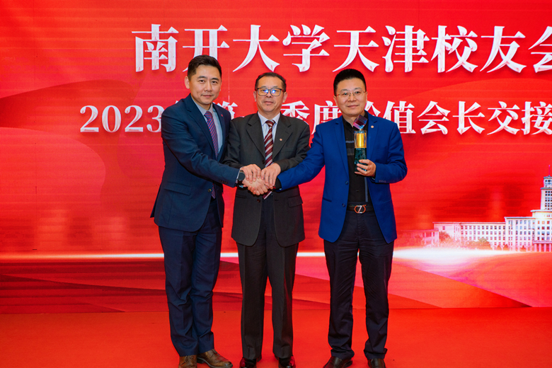南开大学天津校友会理事长詹先华、2022年度第四季度轮值会长张弥,共同为2023年第一季度轮值会长曲万成传递“轮值会长接力杯”。