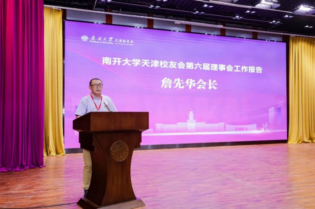 南开大学天津校友会第六届理事会会长詹先华作《南开大学天津校友会第六届理事会工作报告》,并提请大会代表审议。他在《工作报告》中全面总结了校友会五年来始终秉承不忘“服务校友、服务母校、服务社会”的宗旨和初心,积极探索符合天津校友会健康稳定持续发展的工作机制、全面增强校友会各种服务功能、扩展校友会平台的影响力。
