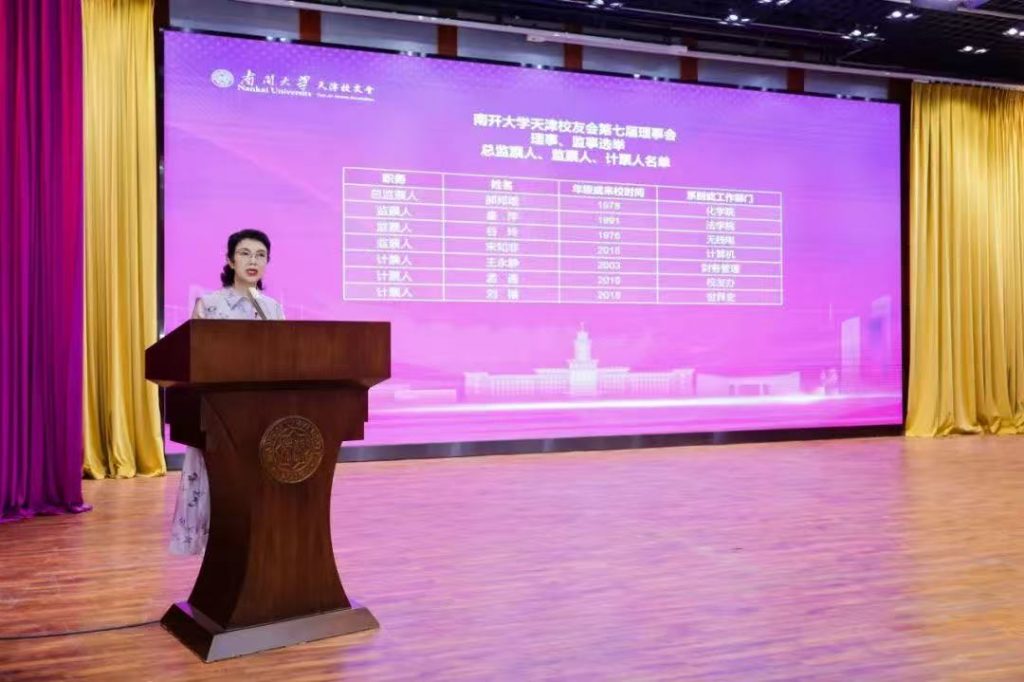 大会第二阶段,由南开大学天津校友会第七届理事会新当选秘书长蒋宏建主持,主要宣布选举结果和表决通过的各类人员名单、制度等。